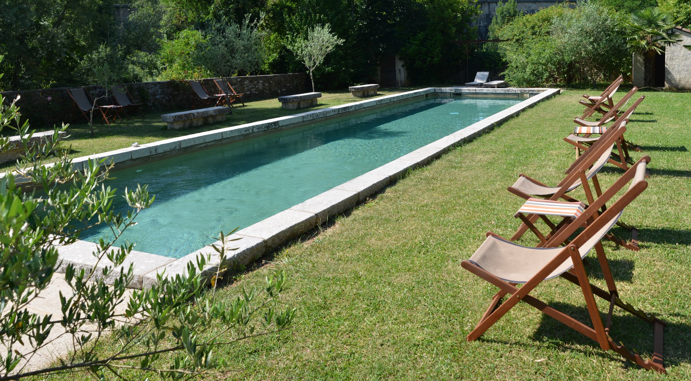 Chambre d’Hôtes de charme avec piscine, le Château d’Uzer propose une grande piscine, comme un bassin de nage, ourlé de pierres.
